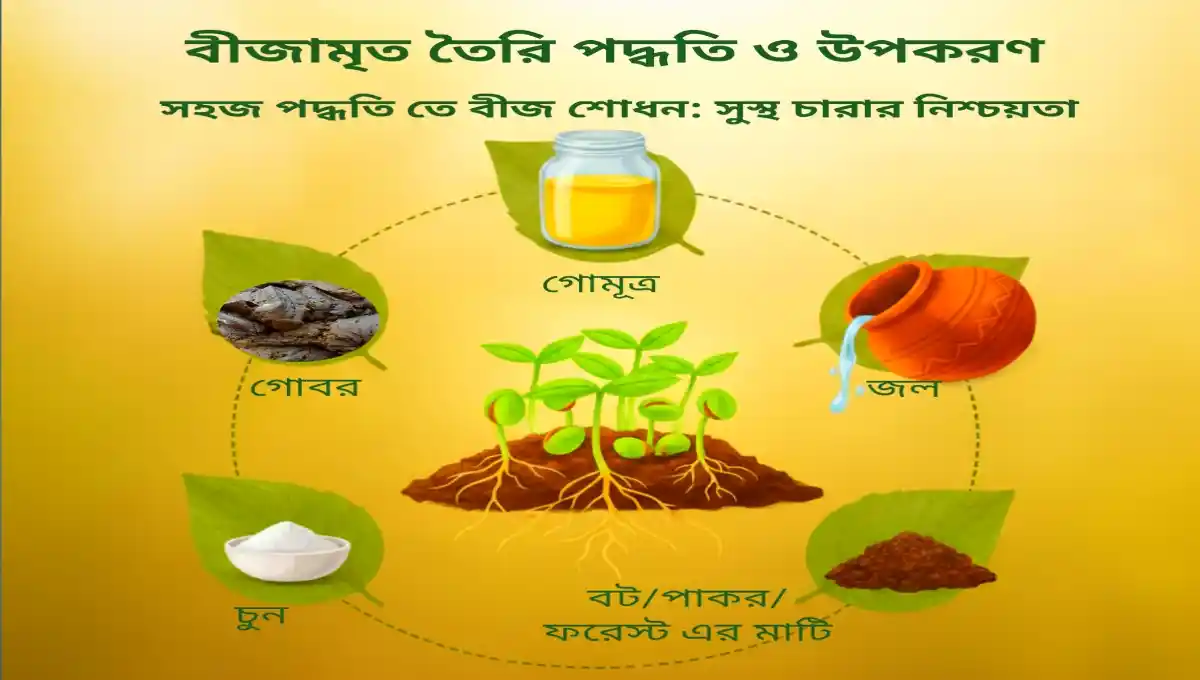 বীজ শোধন ও বীজামৃত: ধান বাছাই করার পর সেটিকে শোধন করা বাধ্যতামূলক। বীজ বাহিত রোগ যেমন—গোড়াপচা বা বাদামি দাগ রুখতে আমরা বীজামৃত দিয়ে বীজ ভিজিয়ে অঙ্কুরোদ্গম করে নেব। [বীজামৃত তৈরির সহজ নিয়মটি পড়তে এই লিঙ্কে ক্লিক করুন]। এই পদ্ধতিটি গ্রহণ করলে আমাদের বীজের অংকুরোদগম হবে চমৎকার এবং চারা হবে শক্তিশালী।